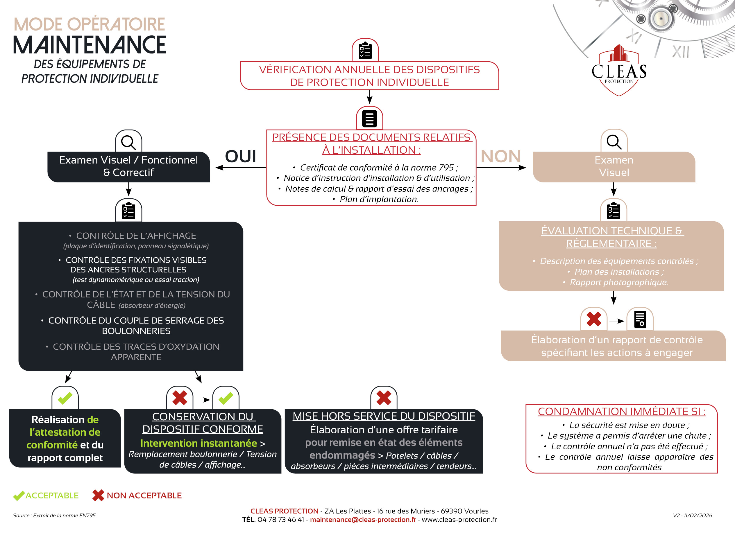 Conformément à la réglementation en vigueur, nous vous rappelons que l’ensemble des systèmes de protection individuelle doit être maintenu en état de conformité avec les règles techniques de conception et de construction applicable lors de la mise en service